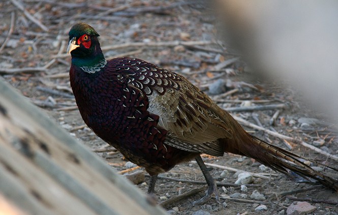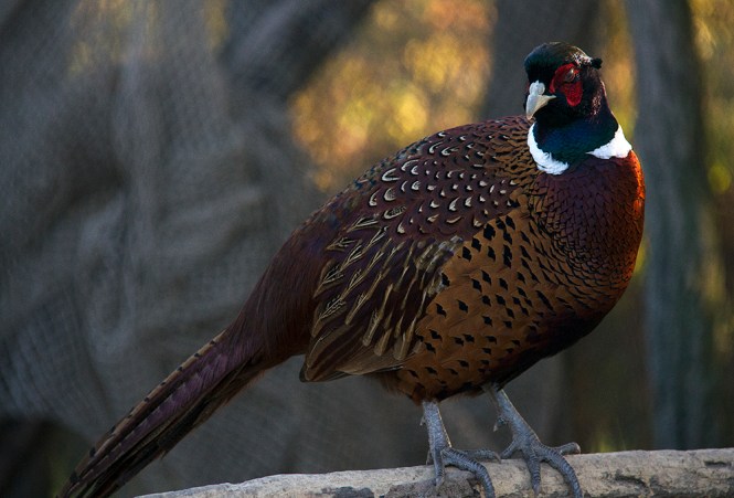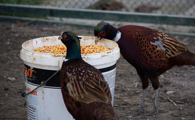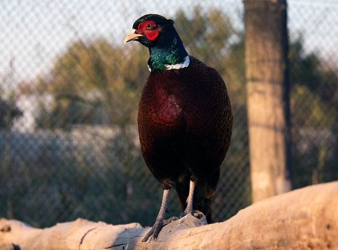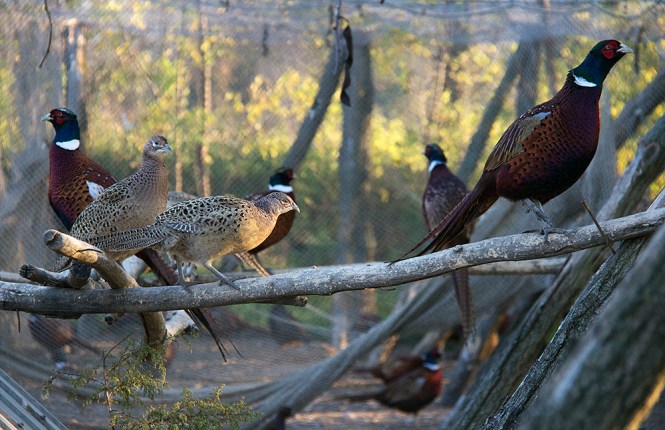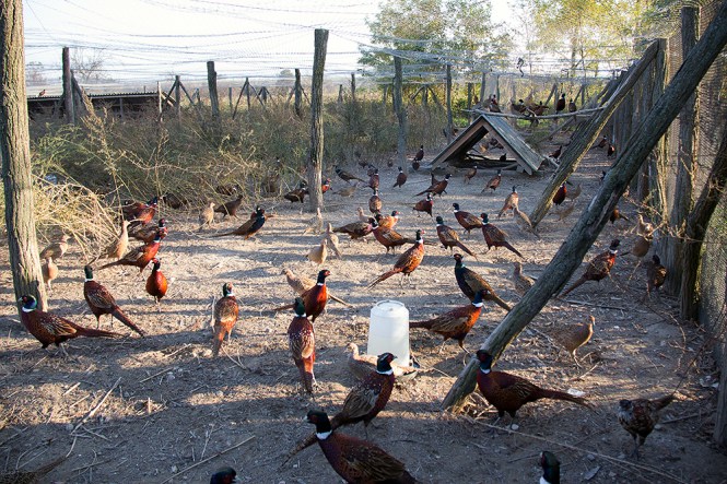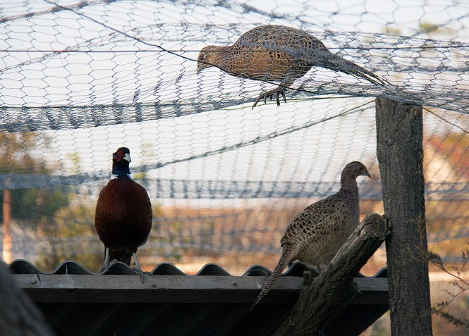 На горњој слици се види како фазан, који је дошао из атара стоји одгоре на фазанерији и покушава да уђе код других фазана.