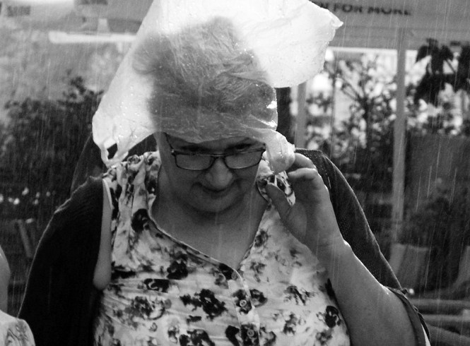 Пролазници на улици сакрили су се у локале и пасаже, а малобројни су остали на улици и кроз кишу, која је снажно лила, упорно настављали својим путем. При томе су се на разне начине сналазили да не покисну. Ако постоји нешто што је посебно упечатљиво у свему томе, онда то јесте субјективни утисак аутора, да не постоје анонимнији пролазници на улици од оних који беже од пљуска. Као да им та тренутна потреба да се склоне, или пожуре својим путем, одузима сваку другу личну упечатљивост.