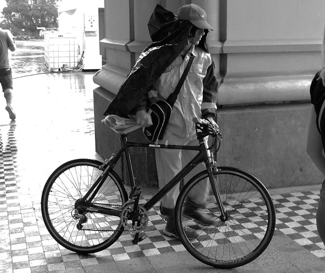 Улаз у „Катедралу“ као принудно склониште од пљуска и радник „Чистоће“ који се заклонио ђубретарском кесом.