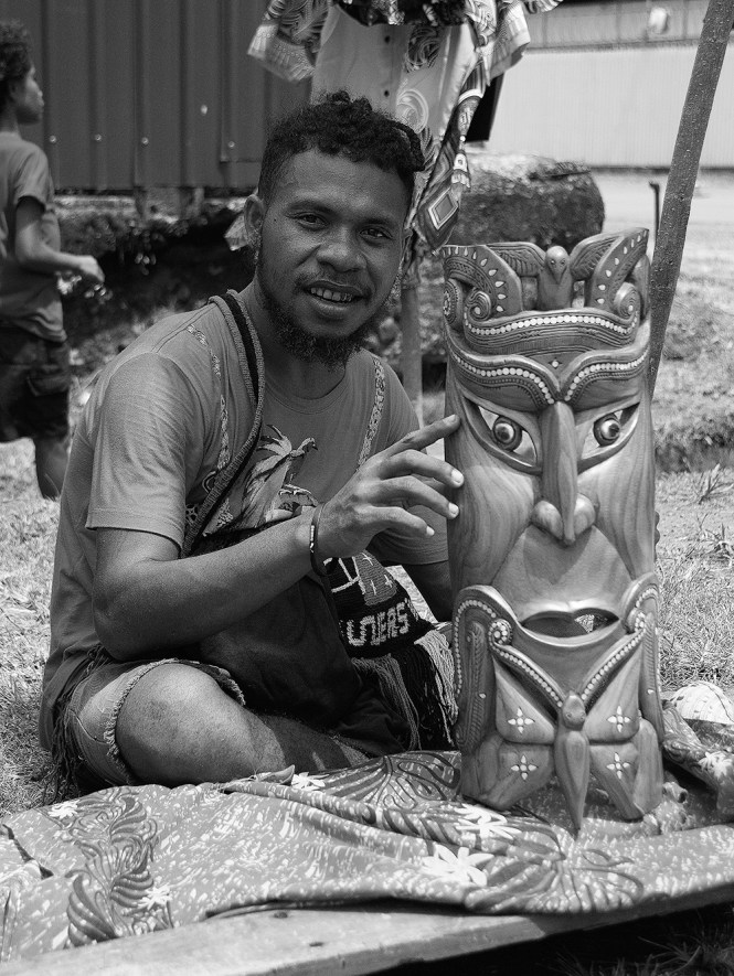 На слици испод је дрводеља Том Џејмс, који продаје туристима ритуалну маску. Како ми је испричао, требало му је три недеље да је направи и за њу тражи 150 америчких долара. То ми даје инстант увид у животни стандард овог места – три недеље рада очигледно вештог занатлије вреде 150 долара. Ипак Том каже да се од тог заната, којим се бави око годину дана, може живети у том месту.
