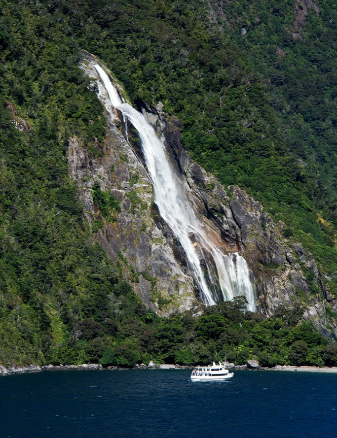 Брод плови крај једног од водопада Милфорд Саунда