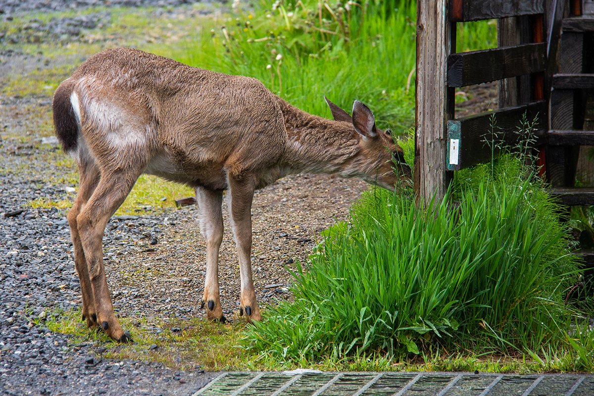 Млади јелен на улици у Кечикану. Аљаска, 2024.